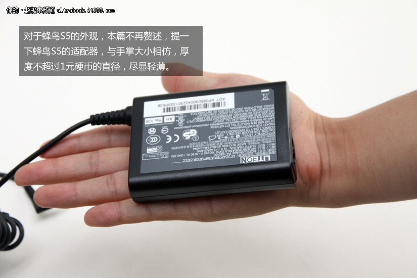 对于蜂鸟S5的外观,本篇不再赘述,提一下蜂鸟S5的适配器,与手掌大小相仿,厚度不超过1元硬币的直径,尽显轻薄。产品图赏文章:http://ultrabook.it168.com/tu/1360669_1.shtml