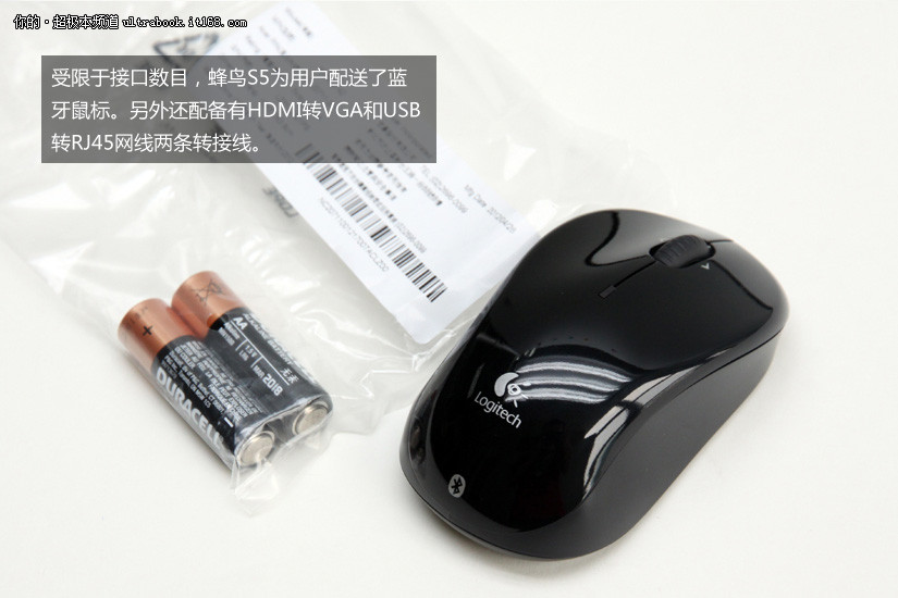 受限于接口数目,蜂鸟S5为用户配送了蓝牙鼠标。另外还配备有HDMI转VGA和USB转RJ45网线两条转接线。