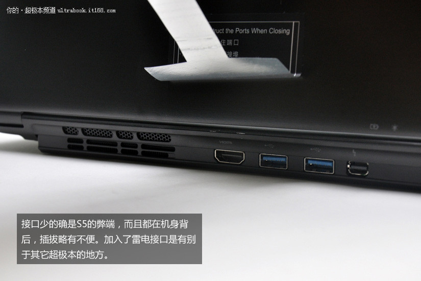 接口少的确是S5的弊端,而且都在机身背后,插拔略有不便。加入了雷电接口是有别于其它超极本的地方。