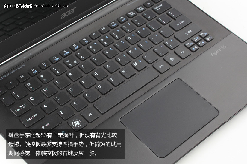 键盘手感比起S3有一定提升,但没有背光比较遗憾。触控板最多支持四指手势,但简短的试用期间感觉一体触控板的右键反应一般。