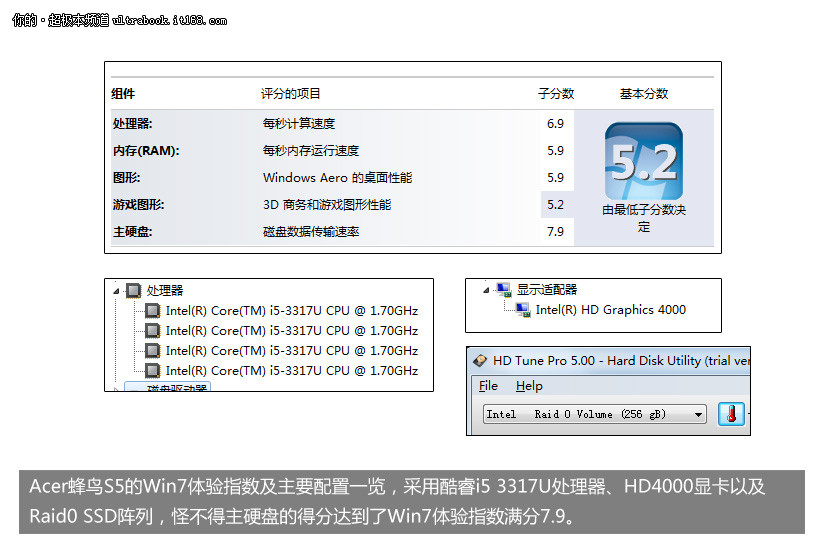 Acer蜂鸟S5的Win7体验指数及主要配置一览,采用酷睿i5 3317U处理器、HD4000显卡以及Raid0 SSD阵列,怪不得主硬盘的得分达到了Win7体验指数满分7.9。