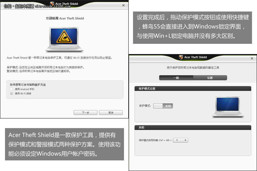 Acer Theft Shield是一款保护工具,提供有保护模式和警报模式两种保护方案。使用该功能必须设定Windows用户帐户密码。设置完成后,拖动保护模式按钮或使用快捷键,蜂鸟S5会直接进入到Windows锁定界面,与使用Win+L锁定电脑并没有多大区别。