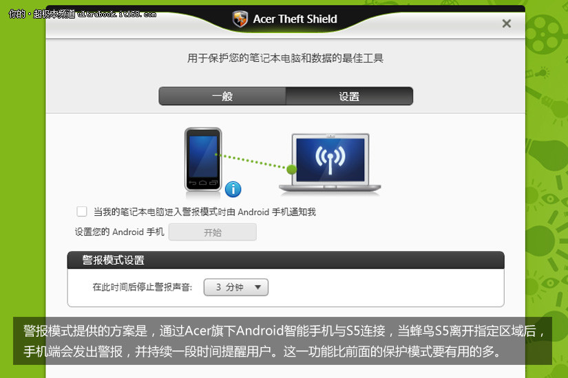 警报模式提供的方案是,通过Acer旗下Android智能手机与S5连接,当蜂鸟S5离开指定区域后,手机端会发出警报,并持续一段时间提醒用户。这一功能比前面的保护模式要有用的多。
