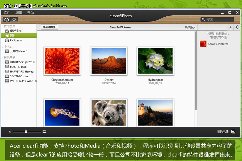 Acer clearfi功能,支持Photo和Media(音乐和视频),程序可以识别到其他设置共享内容了的设备,但是clearfi的应用接受度比较一般,而且公司不比家庭环境,clearfi的特性很难发挥出来。