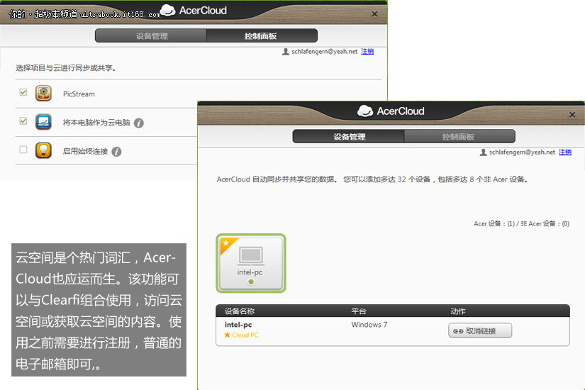 云空间是个热门词汇,AcerCloud也应运而生。该功能可以与Clearfi组合使用,访问云空间或获取云空间的内容。使用之前需要进行注册,普通的电子邮箱即可,。