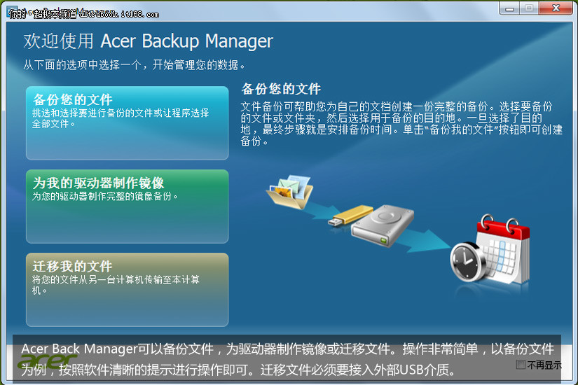 Acer Back Manager可以备份文件,为驱动器制作镜像或迁移文件。操作非常简单,以备份文件为例,按照软件清晰的提示进行操作即可。迁移文件必须要接入外部USB介质。