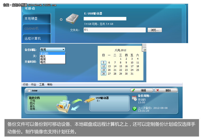 备份文件可以备份到可移动设备、本地磁盘或远程计算机之上,还可以定制备份计划或仅选择手动备份。制作镜像也支持计划任务。