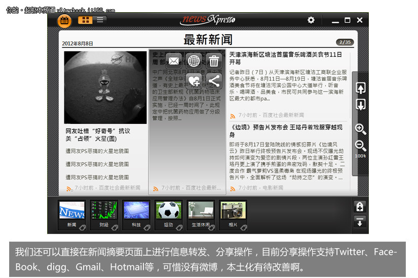 我们还可以直接在新闻摘要页面上进行信息转发、分享操作,目前分享操作支持Twitter、FaceBook、digg、Gmail、Hotmail等,可惜没有微博,本土化有待改善啊。