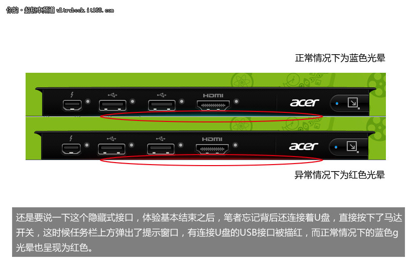还是要说一下这个隐藏式接口,体验基本结束之后,笔者忘记背后还连接着U盘,直接按下了马达开关,这时候任务栏上方弹出了提示窗口,有连接U盘的USB接口被描红,而正常情况下的蓝色光晕也呈现为红色。
