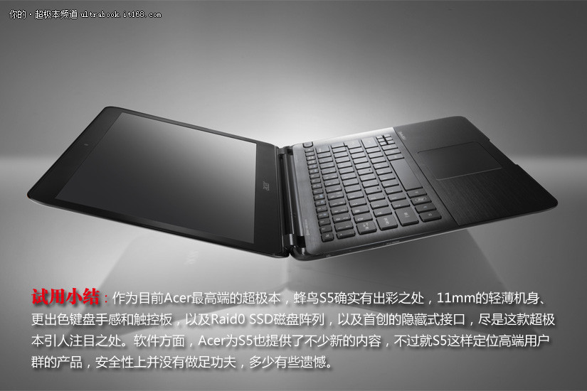 作为目前Acer最高端的超极本,蜂鸟S5确实有出彩之处,11mm的轻薄机身、更出色键盘手感和触控板,以及Raid0 SSD磁盘阵列,以及首创的隐藏式接口,尽是这款超极本引人注目之处。软件方面,Acer为S5也提供了不少新的内容,不过就S5这样定位高端用户群的产品,安全性上并没有做足功夫,多少有些遗憾。