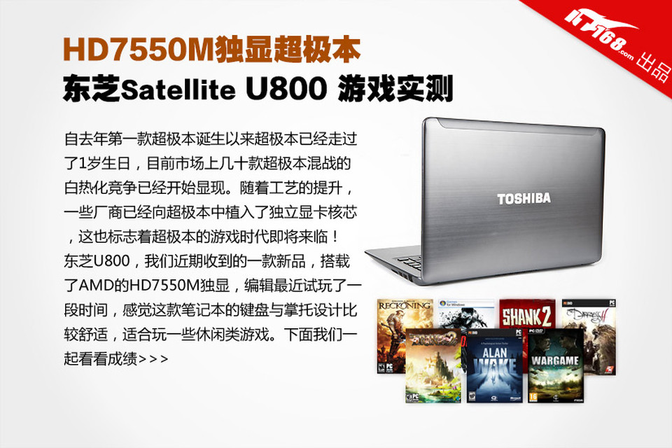 东芝U800,我们近期收到的一款新品,搭载了AMD的HD7550M独显,编辑最近试玩了一段时间,感觉这款笔记本的键盘与掌托设计比较舒适,适合玩一些休闲类游戏。下面我们一起看看成绩>>>