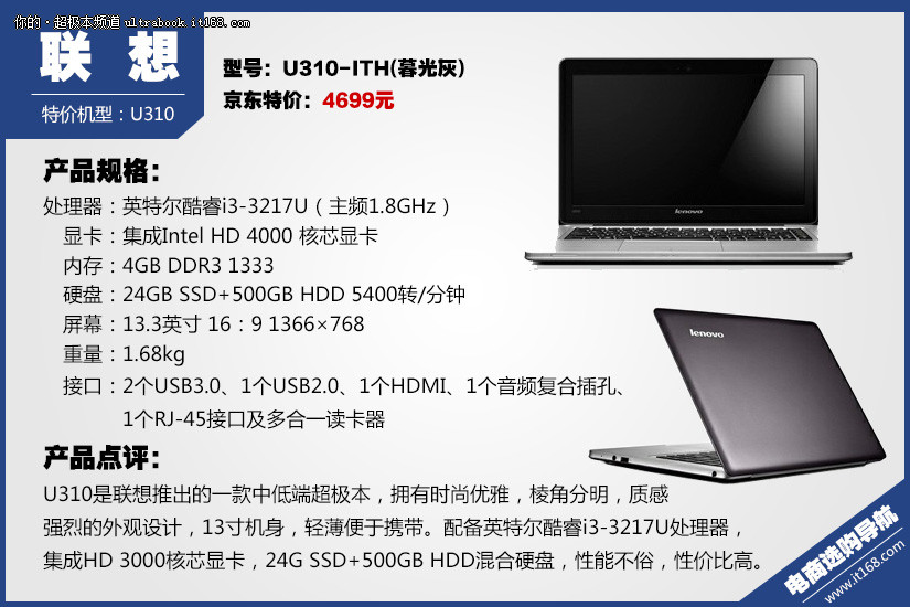 U310是联想推出的一款中低端超极本,拥有时尚优雅,棱角分明,质感强烈的外观设计,13寸机身,轻薄便于携带。配备英特尔酷睿i3-3217U处理器,集成HD 3000核芯显卡,24G SSD+500GB HDD混合硬盘,性能不俗,性价比高。