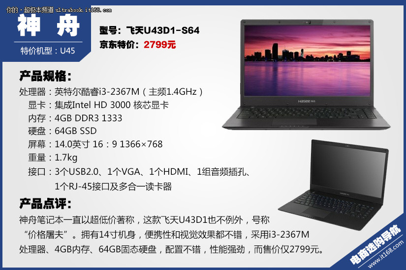神舟笔记本一直以超低价著称,这款飞天U43D1也不例外,号称“价格屠夫”。拥有14寸机身,便携性和视觉效果都不错,采用i3-2367M处理器、4GB内存、64GB固态硬盘,配置不错,性能强劲,而售价仅2799元。