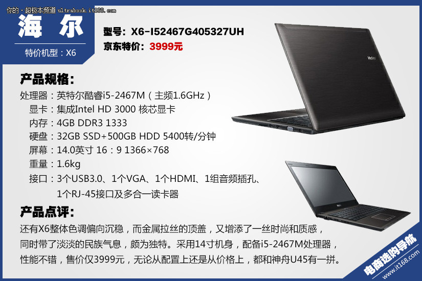 还有X6整体色调偏向沉稳,而金属拉丝的顶盖,又增添了一丝时尚和质感,同时带了淡淡的民族气息,颇为独特。采用14寸机身,配备i5-2467M处理器,性能不错,售价仅3999元,无论从配置上还是从价格上,都和神舟U45有一拼。