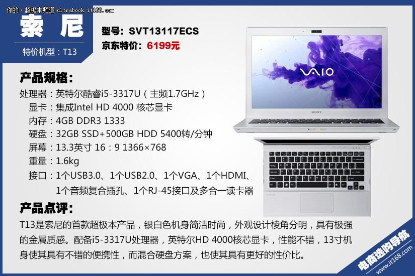 T13是索尼的首款超极本产品,银白色机身简洁时尚,外观设计棱角分明,具有极强的金属质感。配备i5-3317U处理器,英特尔HD 4000核芯显卡,性能不错,13寸机身使其具有不错的便携性,而混合硬盘方案,也使其具有更好的性价比。