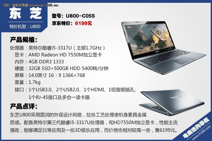 东芝U800采用圆润的外观设计风格,拉丝工艺处理使机身更具金属质感。配备英特尔第三代酷睿i5-3317U处理器,和HD7550M独立显卡,性能主流强劲,能够满足日常应用及一些3D娱乐应用,而价格也相对较高一些,售6199元。