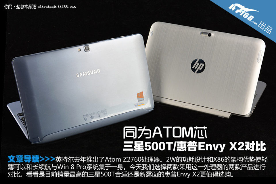 英特尔去年推出了Atom Z2760处理器。2W的功耗设计和X86的架构优势使轻薄可以和长续航与Win 8 Pro系统集于一身。今天我们选择两款采用这一处理器的两款产品进行对比。看看是目前销量最高的三星500T合适还是新露面的惠普Envy X2更值得选购。