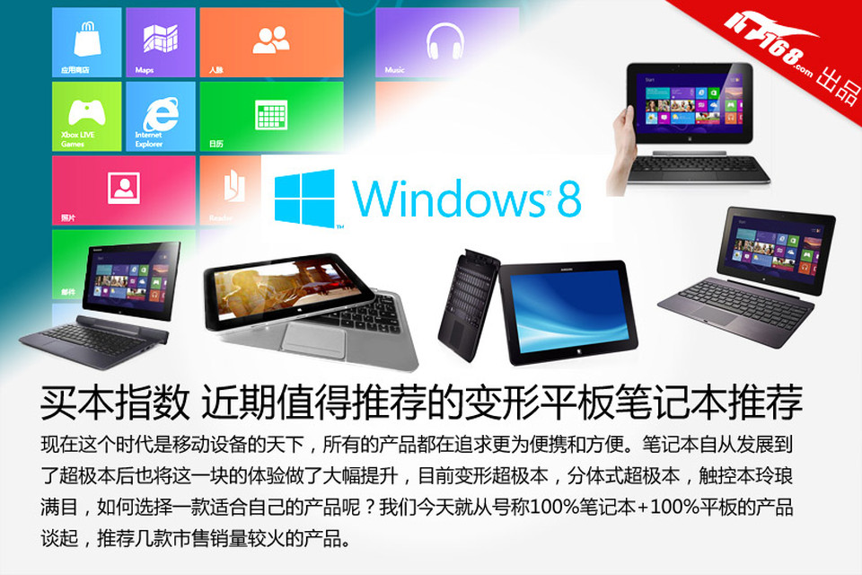 现在这个时代是移动设备的天下,所有的产品都在追求更为便携和方便。笔记本自从发展到了超极本后也将这一块的体验做了大幅提升,目前变形超极本,分体式超极本,触控本玲琅满目,如何选择一款适合自己的产品呢?我们今天就从号称100%笔记本+100%平板的产品谈起,推荐几款市售销量较火的产品。