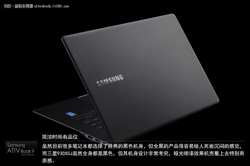 虽然目前很多笔记本都选择了经典的黑色机身,但全黑的产品很容易给人死板沉闷的感觉,而三星930X5J虽然全身都是黑色,但其机身设计非常考究,哑光喷漆效果机壳看上去特别有质感。