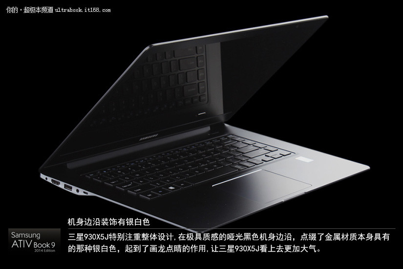三星930X5J特别注重整体设计,在极具质感的哑光黑色机身边沿,点缀了金属材质本身具有的那种银白色,起到了画龙点睛的作用,让三星930X5J看上去更加大气。