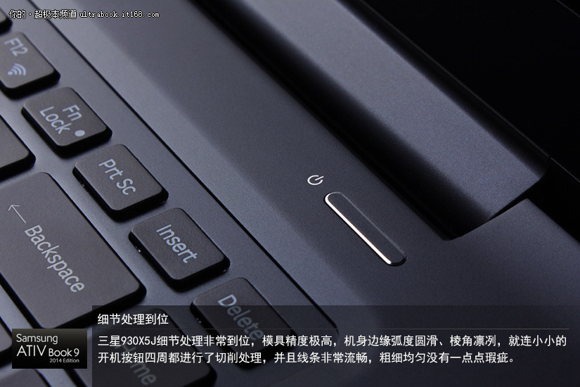 三星930X5J细节处理非常到位,模具精度极高,机身边缘弧度圆滑、棱角凛冽,就连小小的开机按钮四周都进行了切削处理,并且线条非常流畅,粗细均匀没有一点点瑕疵。
