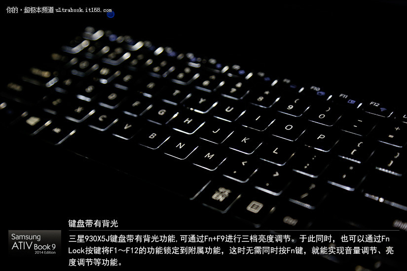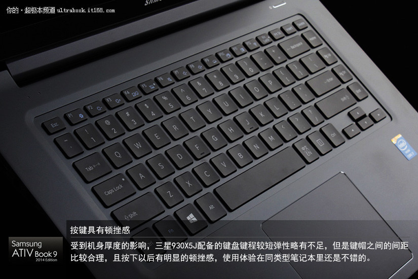受到机身厚度的影响,三星930X5J配备的键盘键程较短弹性略有不足,但是键帽之间的间距比较合理,且按下以后有明显的顿挫感,使用体验在同类型笔记本里还是不错的。