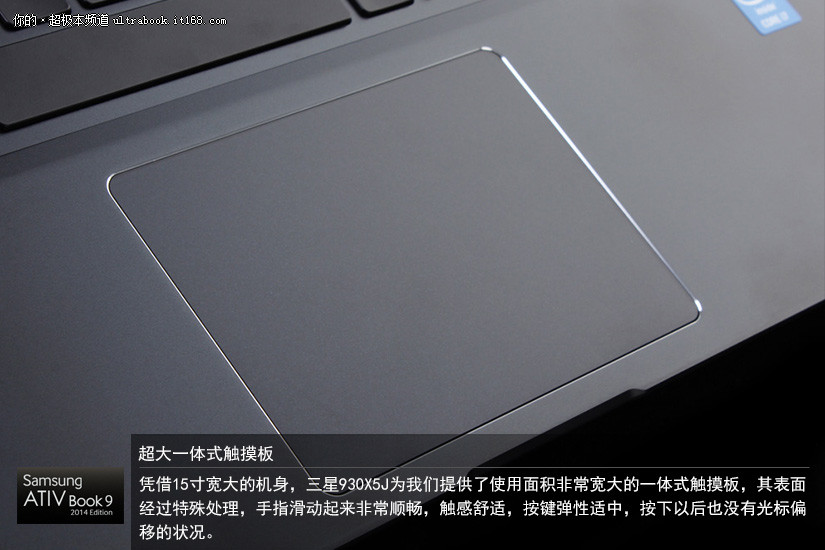 凭借15寸宽大的机身,三星930X5J为我们提供了使用面积非常宽大的一体式触摸板,其表面经过特殊处理,手指滑动起来非常顺畅,触感舒适,按键弹性适中,按下以后也没有光标偏移的状况。