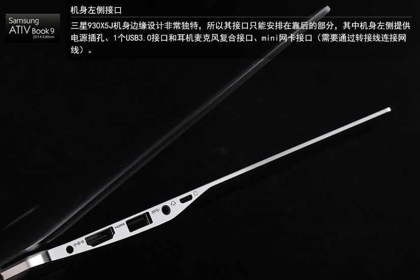 三星930X5J机身右侧提供2个UDB3.0接口和1个Mini VGA接口(需要转接线)这样的接口配置对于一款厚度仅为14.8mm的超极本来说,已经非常丰富了。