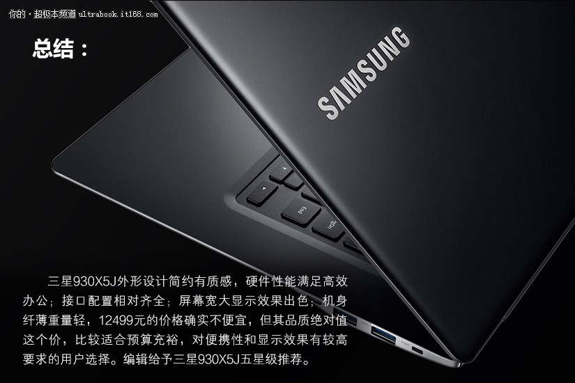 三星930X5J外形设计简约有质感,硬件性能满足高效办公;接口配置相对齐全;屏幕宽大显示效果出色;机身纤薄重量轻,12499元的价格确实不便宜,但其品质绝对值这个价,比较适合预算充裕,对便携性和显示效果有较高要求的用户选择。编辑给予三星930X5J五星级推荐。