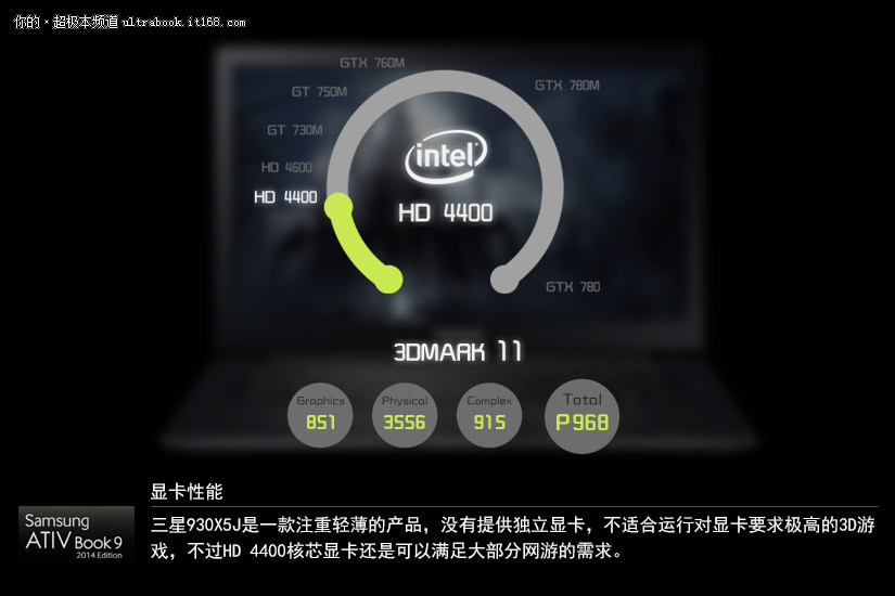 三星930X5J是一款注重轻薄的产品,没有提供独立显卡,不适合运行对显卡要求极高的3D游戏,不过HD 4400核芯显卡还是可以满足大部分网游的需求。