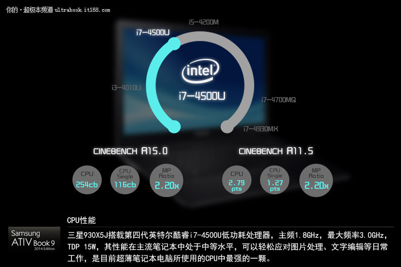 三星930X5J搭载第四代英特尔酷睿i7-4500U低功耗处理器,主频1.8GHz,最大频率3.0GHz,TDP 15W,其性能在主流笔记本中处于中等水平,可以轻松应对图片处理、文字编辑等日常工作,是目前超薄笔记本电脑所使用的CPU中最强的一颗。