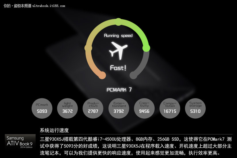 三星930X5J搭载第四代酷睿i7-4500U处理器、8GB内存、256GB SSD,这使得它在PCMark7 测试中获得了5093分的好成绩,这说明三星930X5J在程序载入速度、开机速度上超过大部分主流笔记本,可以为我们提供更快的响应速度,使用起来感觉更加流畅,执行效率更高。