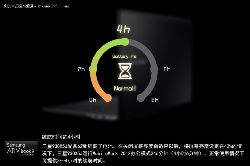 三星930X5J配备62Wh锂离子电池,在关闭屏幕亮度自适应以后,将屏幕亮度设定在40%的情况下,三星930X5J运行MobileMark 2012办公模式246分钟(4小时6分钟),正常使用情况下可提供3~4小时的续航时间。