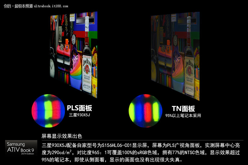 三星930X5J配备自家型号为S156HL06-C01显示屏,屏幕为PLS广视角面板,实测屏幕中心亮度为290cd/m?,对比度965:1可覆盖100%的sRGB色域,拥有77%的NTSC色域,显示效果超过95%的笔记本,即使从侧面看,显示的画面也没有出现很大失真。