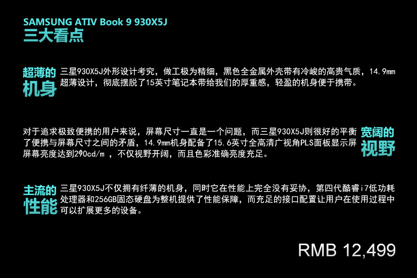 三星930X5J是一款定位高端的15英寸超薄本,全黑色金属机身冷峻高贵有品质,14.9mm超薄设计,让它成为目前最纤薄的15英寸笔记本,将便携与大屏完美的结合到一起,让那些经常外出的用户……