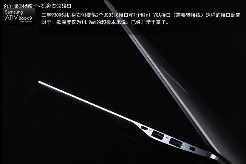 三星930X5J机身右侧提供2个USB3.0接口和1个Mini VGA接口(需要转接线)这样的接口配置对于一款厚度仅为14.9mm的超极本来说,已经非常丰富了。