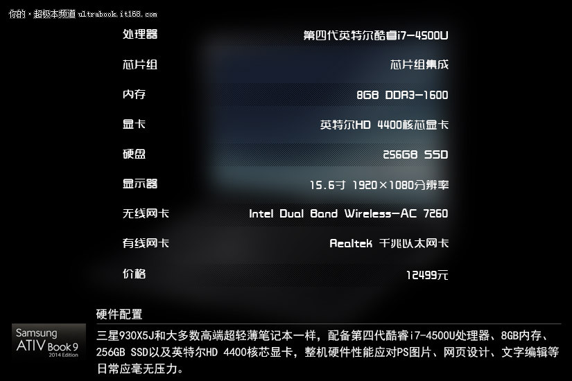 三星930X5J和大多数高端超轻薄笔记本一样,配备第四代酷睿i7-4500U处理器、8GB内存、256GB SSD以及英特尔HD 4400核芯显卡,整机硬件性能应对PS图片、网页设计、文字编辑等日常应毫无压力。